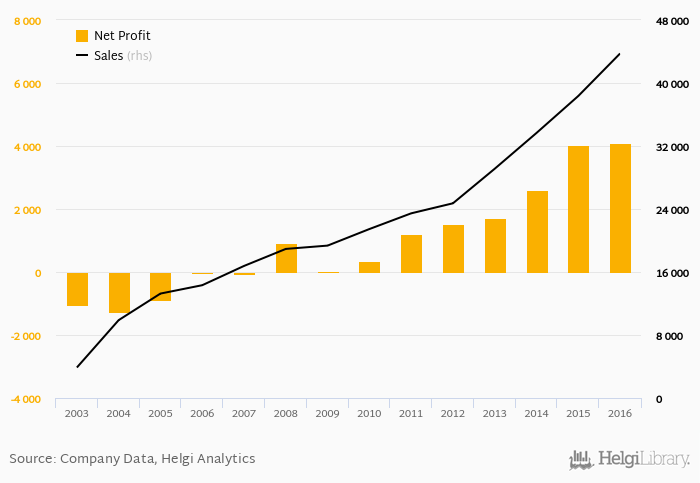 Sales have grown by 11.8% a year on average since 2006. They reached a high of CZK 43,748 mil in 2016 and a low of CZK 3,873 mil in 2003.