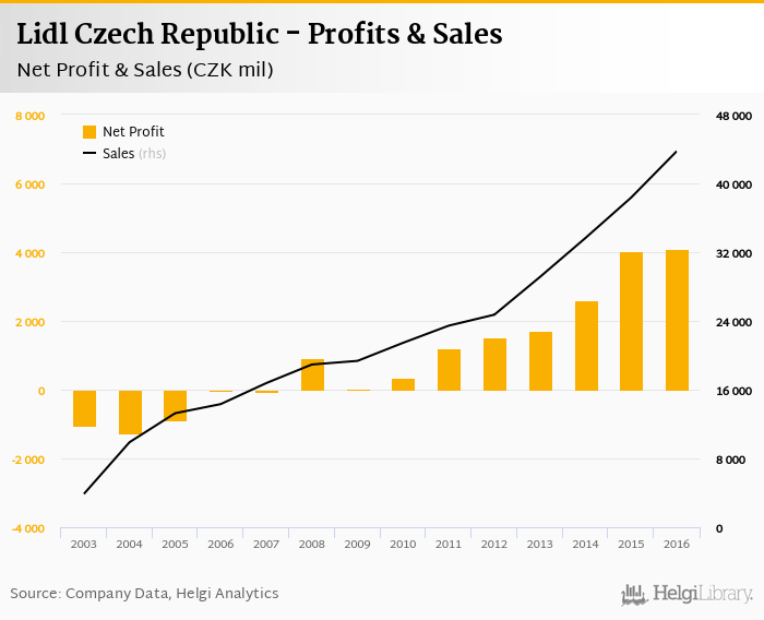 As far as Lidl Czech Republic's peers are concerned, Ahold Czech Republic posted a net profit and sales of CZK 3.86 mil and CZK 49,621 mil in 2016, BILLA Czech Republic generated a net profit of CZK 469 mil (with sales of CZK 22,763 mil), and Kaufland Czech Republic netted USD CZK 1,974 mil (sales of CZK 56,819 mil).
