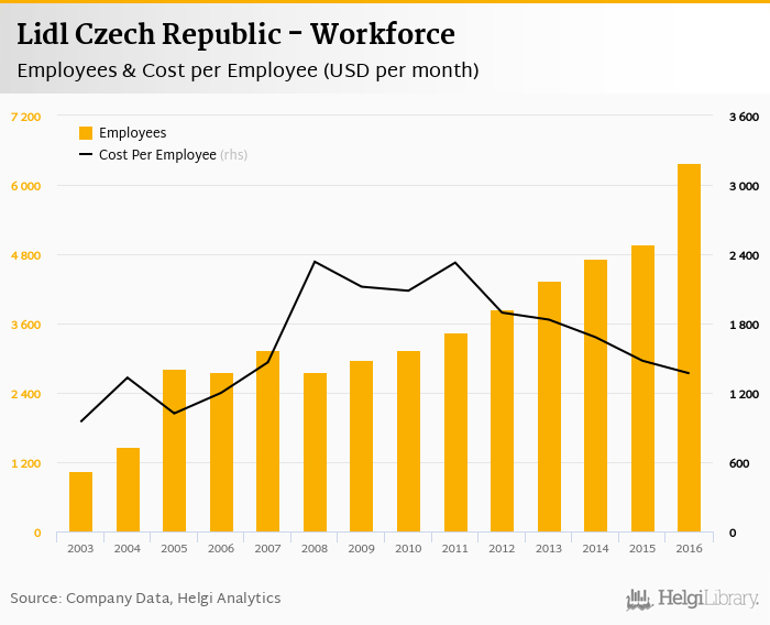Lidl Czech Republic employed 6,375 employees in 2016, up 28.3% compared to the previous year. Historically, between 2001 and 2016, the firm's workforce hit a high of 6,375 employees in 2016 and a low of 35.0 employees in 2001.