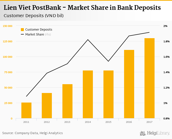Lien Viet PostBank accounted for 1.91% of all customer deposits taken by banks in Vietnam at the end of 2017. Historically, the bank’s market share in customer deposits reached an all time high of 1.91% in 2017 and an all time low of 1.08% in 2011.
