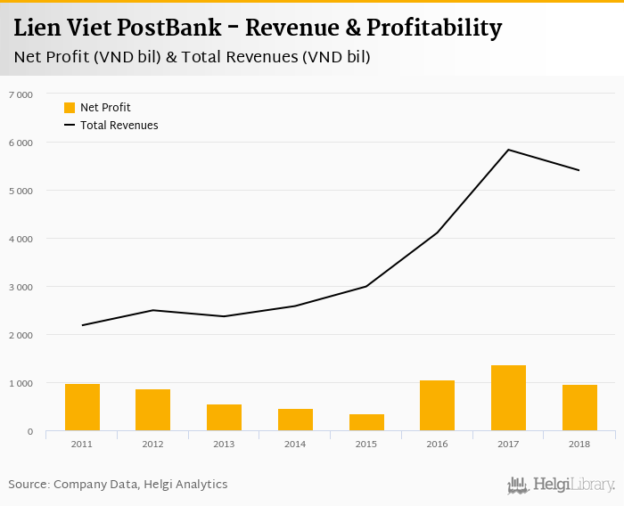 Lien Viet PostBank made a net profit of VND 961 bil under revenues of VND 5,401 bil in 2018, up -29.4% and -7.38% respectively compared to the previous year.
