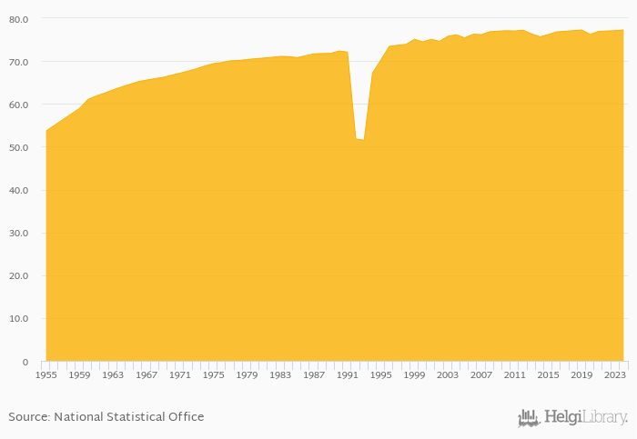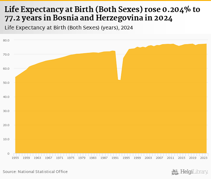 Life expectancy for both sexes rose 0.204% to 77.2 years in Bosnia and Herzegovina in 2024, according to the National Statistical Office.