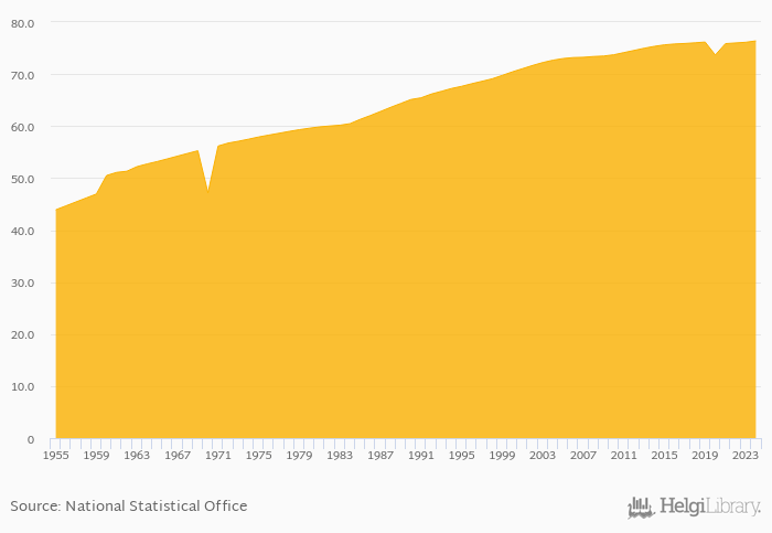 Historically, life expectancy for both sexes in Peru reached an all time high of 76.4 years in 2024 and an all time low of 43.9 years in 1955. When compared to Peru's main peers, life expectancy for both sexes in Bolivia amounted to 68.7 years, 75.4 years in Brazil, 81.2 years in Chile and 75.1 years in Colombia in 2024.