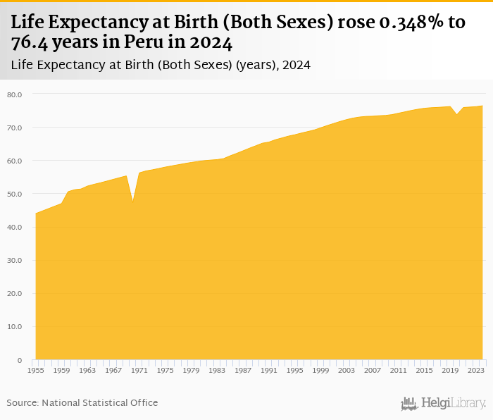 Life expectancy for both sexes rose 0.348% to 76.4 years in Peru in 2024, according to the National Statistical Office.