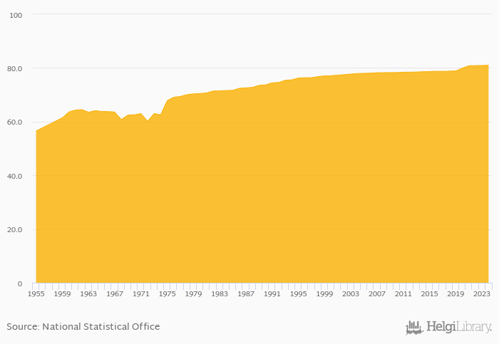 Historically, life expectancy for females in Vietnam reached an all time high of 81.0 years in 2024 and an all time low of 56.5 years in 1955. When compared to Vietnam's main peers, life expectancy for females in Cambodia amounted to 76.4 years, 77.5 years in China, 72.0 years in Laos and 78.7 years in Thailand in 2024.