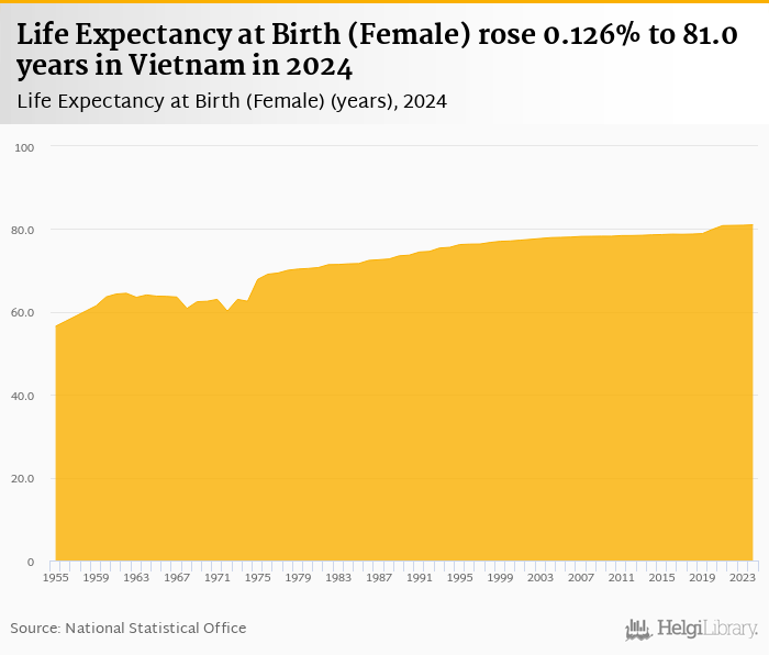 Life expectancy for females rose 0.126% to 81.0 years in Vietnam in 2024, according to the National Statistical Office.