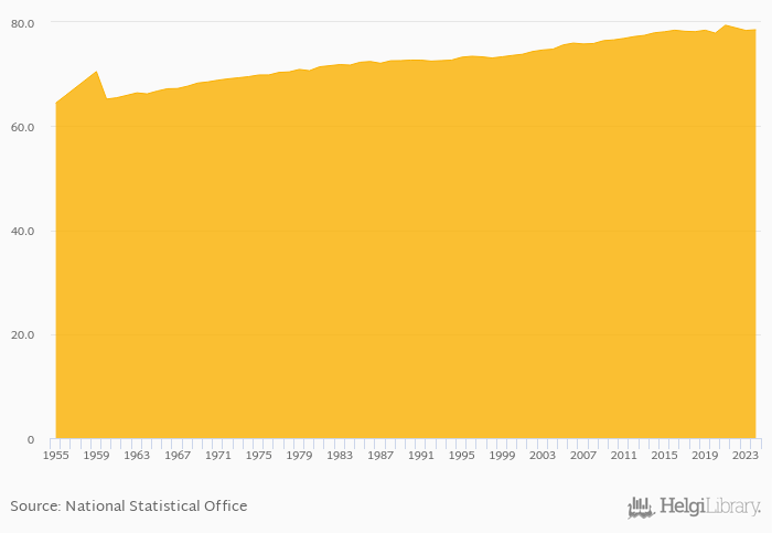 Historically, life expectancy for females in Georgia reached an all time high of 79.4 years in 2021 and an all time low of 64.4 years in 1955. When compared to Georgia's main peers, life expectancy for females in Armenia amounted to 78.6 years, 74.5 years in Azerbaijan, 75.1 years in Russia and 80.1 years in Turkey in 2024.