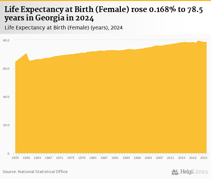 Life expectancy for females rose 0.168% to 78.5 years in Georgia in 2024, according to the National Statistical Office.