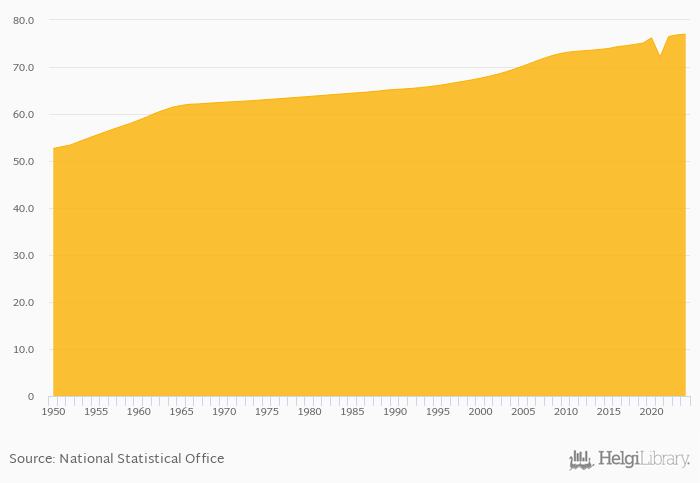 Historically, life expectancy for females in Suriname reached an all time high of 77.0 years in 2024 and an all time low of 52.7 years in 1950. When compared to Suriname's main peers, life expectancy for females in Brazil amounted to 79.1 years, 74.1 years in Guyana, 76.8 years in Trinidad and Tobago and 76.7 years in Venezuela in 2024.