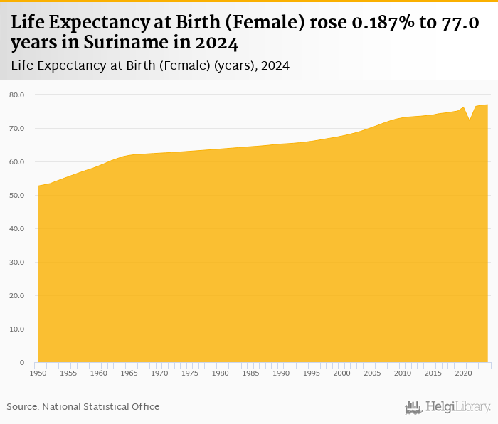 Life expectancy for females rose 0.187% to 77.0 years in Suriname in 2024, according to the National Statistical Office.