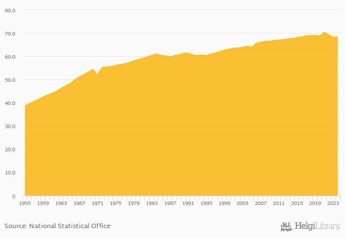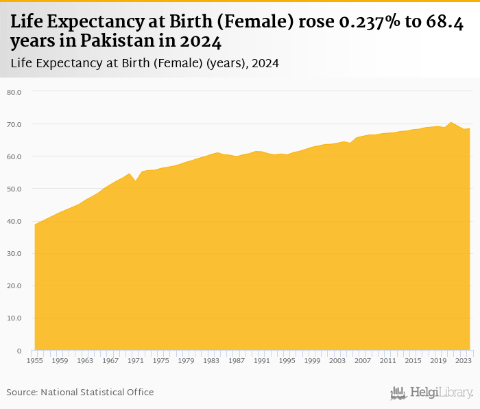 Life expectancy for females rose 0.237% to 68.4 years in Pakistan in 2024, according to the National Statistical Office.