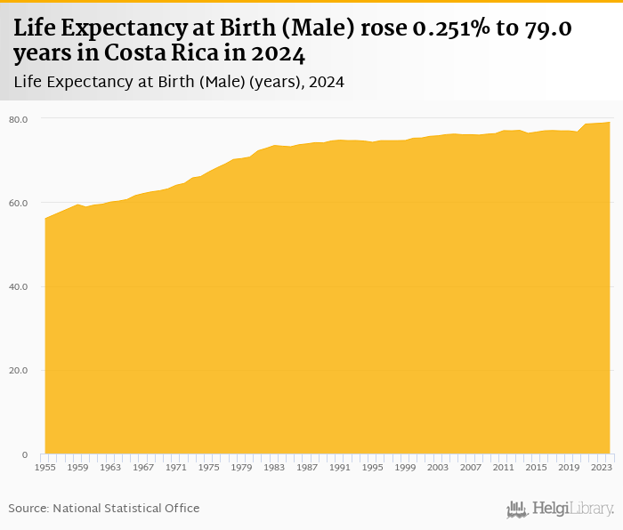 Life expectancy for males rose 0.251% to 79.0 years in Costa Rica in 2024, according to the National Statistical Office.