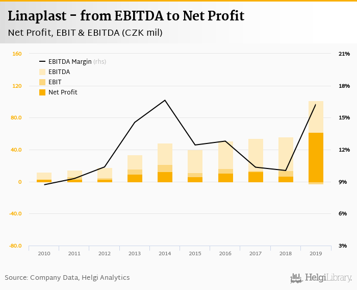 Linaplast made a net profit of CZK 61.9 mil with revenues of CZK 607 mil in 2019, up by 799% and up by 8.82%, respectively, compared to the previous year. This translates into a net margin of 10.2%.