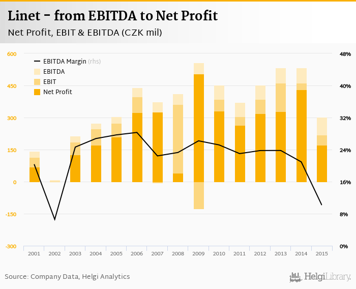 Linet made a net profit of CZK 171 mil with revenues of CZK 2,988 mil in 2015, down by 60.5% and up by 17.2%, respectively, compared to the previous year. This translates into a net margin of 5.71%.