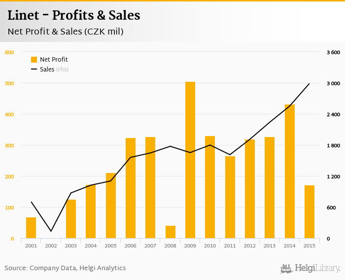 Linet made a net profit of CZK 171 mil in 2015, down 60.5% compared to the previous year. Total sales reached CZK 2,988 mil, which is up 17.2% when compared to the previous year.