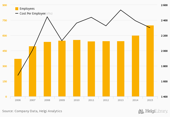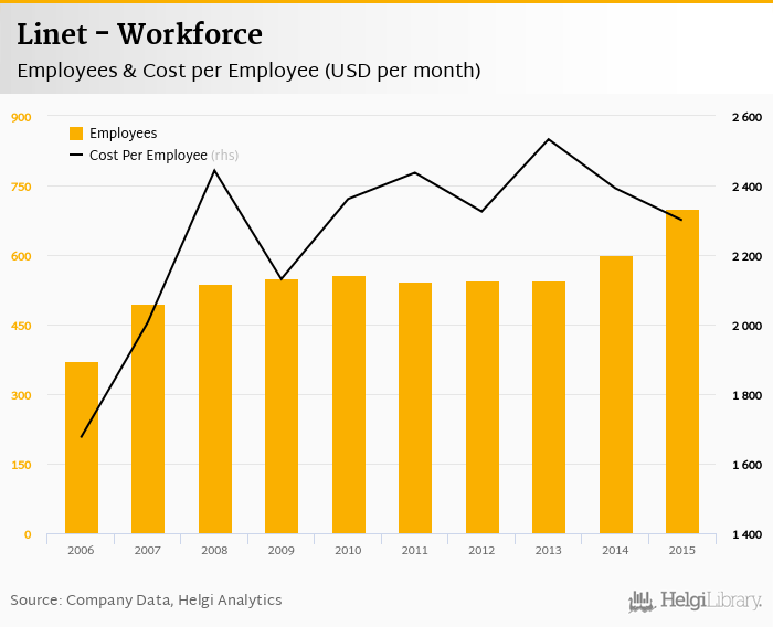 Linet employed 699 employees in 2015, up 16.5% compared to the previous year. Historically, between 2006 and 2015, the firm's workforce hit a high of 699 employees in 2015 and a low of 371 employees in 2006.