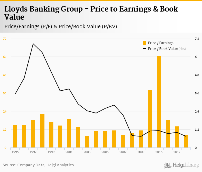 At the end of 2018, the bank traded at price to earnings of 8.58x. Within the last five years, the multiple reached an all time high of 60.7x in 2015 and an all time low of 8.58x in 2018 with an average of 28.1x.