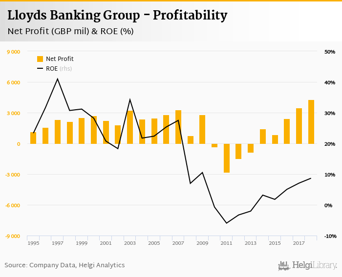 Lloyds Banking Group made a net profit of GBP 4,302 mil in 2018, up 24.4% compared to the previous year. This implies a return on equity of 8.66%.