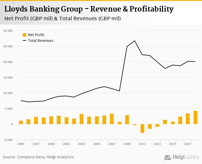 Lloyds Banking Group made a net profit of GBP 4,302 mil under revenues of GBP 20,003 mil in 2018, up 24.4% and -0.160% respectively compared to the previous year.