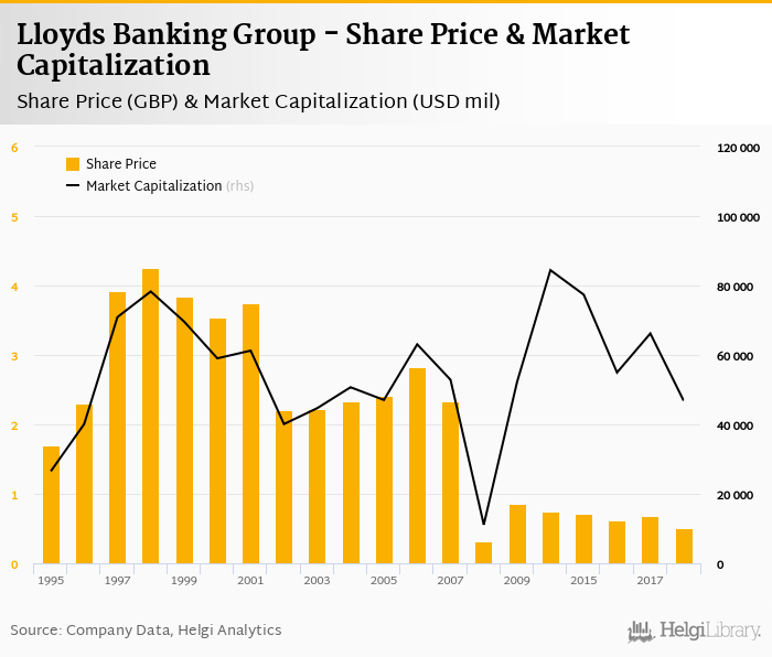 Lloyds Banking Group stock traded at GBP 0.510 per share at the end of 2018 implying a market capitalization of USD 46,835 mil.