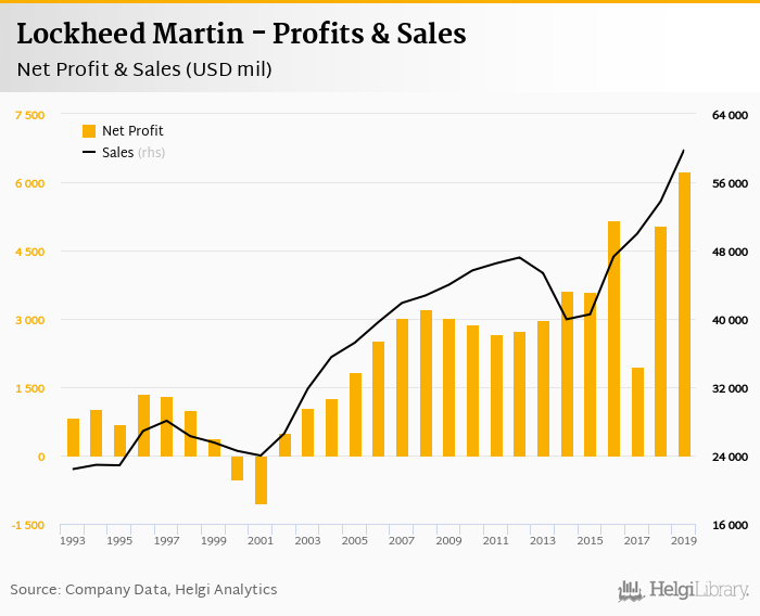 Lockheed Martin made a net profit of USD 6,230 mil in 2019, up 23.5% compared to the previous year. Total sales reached USD 59,812 mil, which is up 11.3% when compared to the previous year.