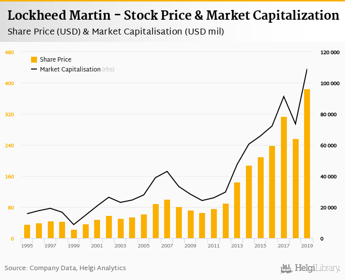 Lockheed Martin stock traded at USD 384 per share at the end 2019 implying a market capitalization of USD 109,026 mil.