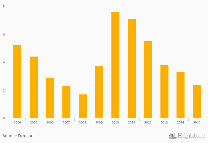 Long-Term Unemployed (As % of Active Population) fell 27.3% to 2.40% in Estonia in 2015, according to Eurostat.