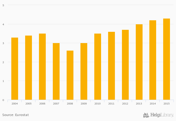 Long-Term Unemployed (As % of Active Population) rose 2.38% to 4.30% in France in 2015, according to Eurostat.
