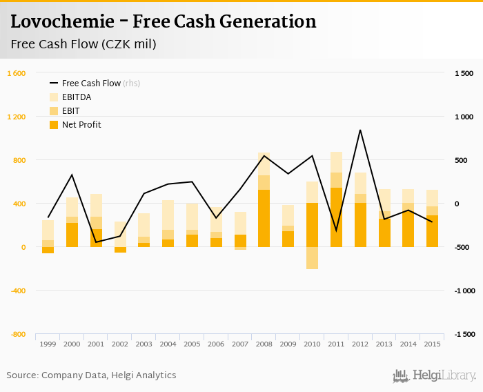 Lovochemie made a net profit of CZK 294 mil with revenues of CZK 5,352 mil in 2015, down by 10.6% and down by 5.28%, respectively, compared to the previous year. This translates into a net margin of 5.50%.