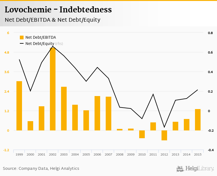 Lovochemie's net debt stood at CZK 688 mil and accounted for 0.214 of equity at the end of 2015. The ratio is up 0.090 pp compared to the previous year.