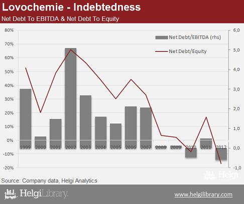 Lovochemie is a Czech company, which produces mineral fertilizers, especially ammonium nitrate and calcium nitrate. In 2012, the Company reached sales of CZK 5.75 bil with a net profit of over CZK 400 mil. In the last five years, profitability of the Company improved significantly (with average ROE of 17.5% in 2008-2012) and the Company repaid all its debts