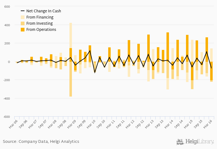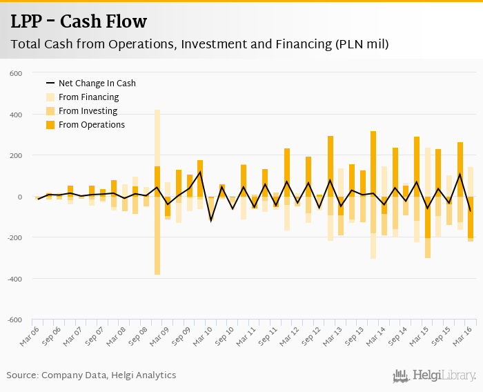 Cash from financing amounted to PLN 142 mil, so the company generated PLN -77.8 mil net cash in 1Q2016.