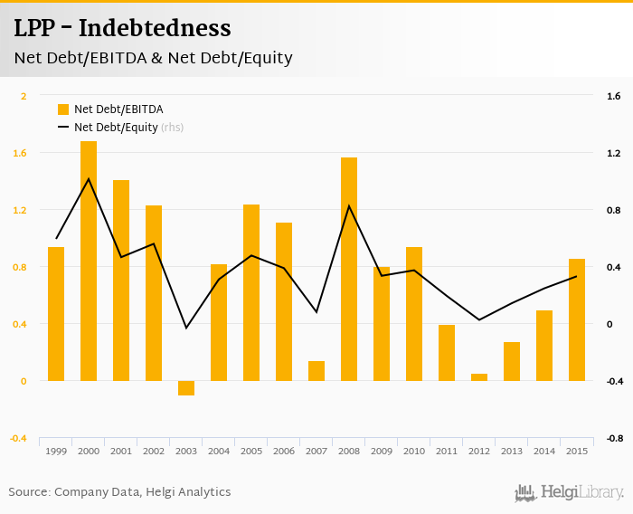 LPP's net debt stood at PLN 621 mil and accounted for 0.329 of equity at the end of 2015. The ratio is up 0.085 pp compared to the previous year.