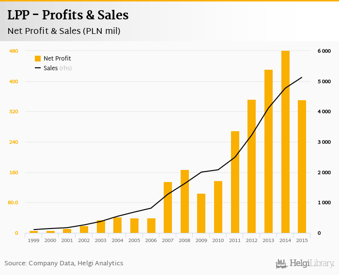 LPP made a net profit of PLN 351 mil in 2015, down 26.7% compared to the previous year. Total sales reached PLN 5,130 mil, which is up 7.57% when compared to the previous year.