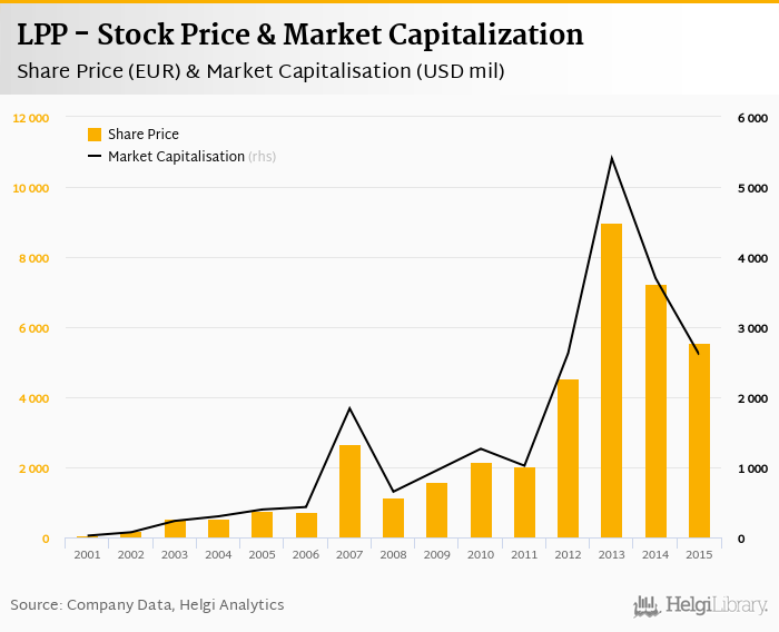LPP stock traded at EUR 5,555 per share at the end 2015 implying a market capitalization of USD 2,606 mil.