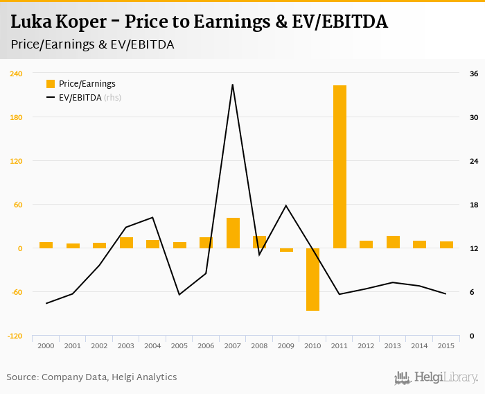 Luka Koper stock traded at EUR 23.0 per share at the end 2015 translating into a market capitalization of USD 390 mil.