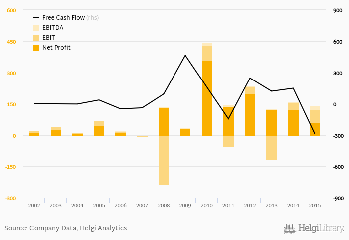 The company generated cash, defined by a sum of net profit and depreciation, of CZK 77.7 mil or 1.20% of sales. When investments are excluded, free cash flow reached CZK -286 mil, or -4.41% of sales in 2015.
