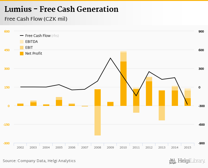 Lumius made a net profit of CZK 60.8 mil with revenues of CZK 6,500 mil in 2015, down by 51% and down by 14.2%, respectively, compared to the previous year. This translates into a net margin of 0.936%.