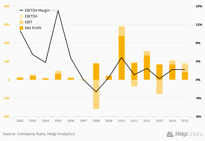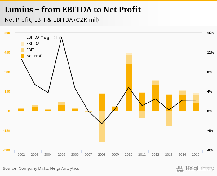 Lumius made a net profit of CZK 60.8 mil with revenues of CZK 6,500 mil in 2015, down by 51% and down by 14.2%, respectively, compared to the previous year. This translates into a net margin of 0.936%.