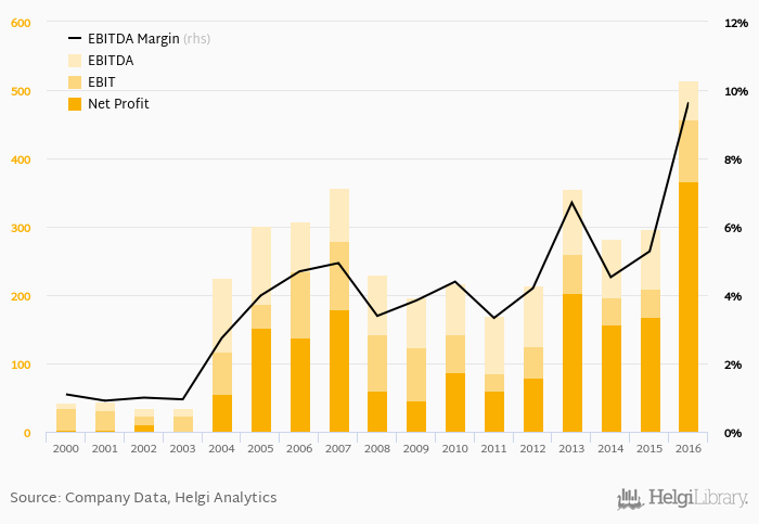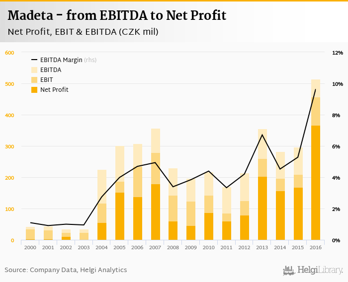 Madeta made a net profit of CZK 367 mil with revenues of CZK 5,330 mil in 2016, up by 118% and down by 5.24%, respectively, compared to the previous year. This translates into a net margin of 6.88%.