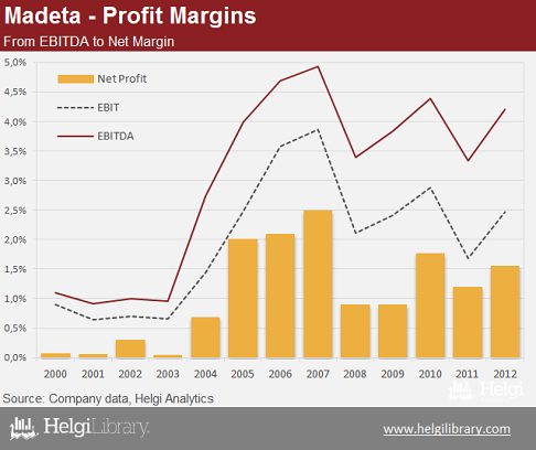 On the other hand, Madeta is decently profitable (average ROE of 12.4% in 2008-2012) and has reduced its indebtedness significantly (to 43% as % of equity at the end of 2012).