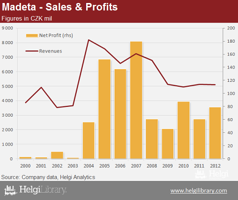 On the other hand, Madeta is decently profitable (average ROE of 12.4% in 2008-2012) and has reduced its indebtedness significantly (to 43% as % of equity at the end of 2012).