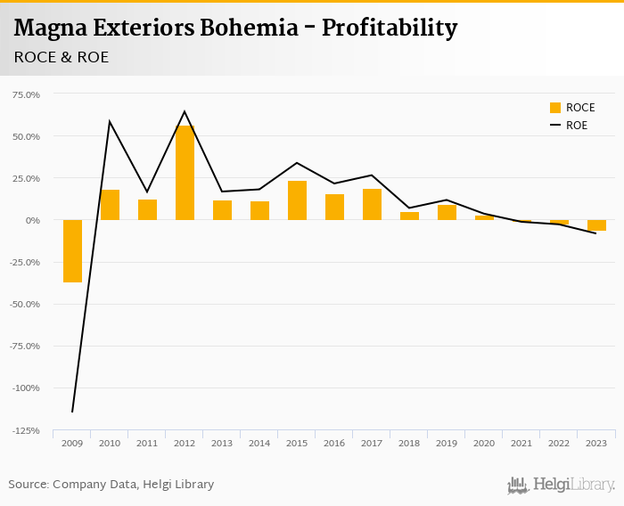 Magna Exteriors Bohemia made a net profit of CZK -429 mil in 2023, down 196% compared to the previous year. Historically, between 2008 and 2023, the company's net profit reached a high of CZK 1,319 mil in 2012 and a low of CZK -1,765 mil in 2009.
