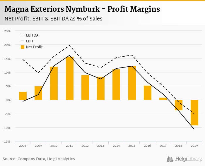 Magna Exteriors Nymburk made a net profit of CZK -453 mil with revenues of CZK 4,956 mil in 2019, down by 189% and up by 16.4%, respectively, compared to the previous year.