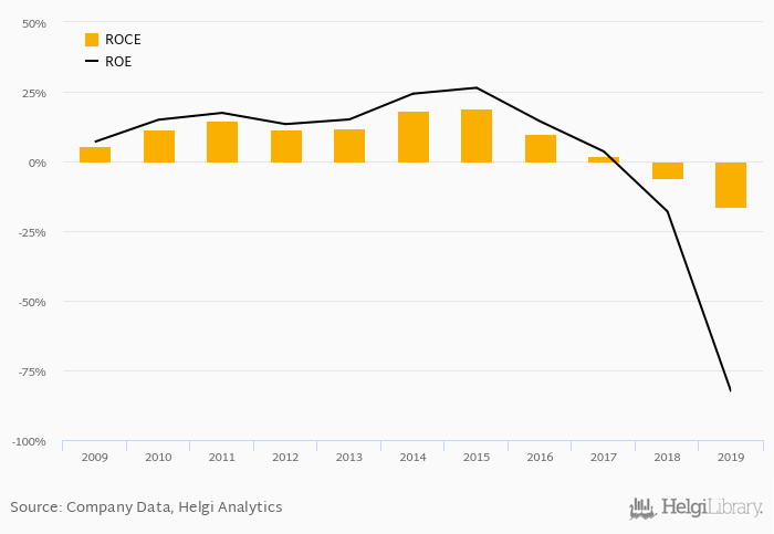 The result implies a return on equity of -82.6% and a return on invested capital of -16.3% in 2019. That is compared to an average of -11.2% and 1.65% over the last five years.