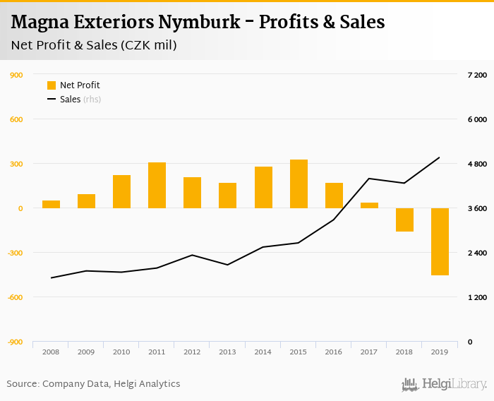 Magna Exteriors Nymburk made a net profit of CZK -453 mil in 2019, down 189% compared to the previous year. Total sales reached CZK 4,956 mil, which is up 16.4% when compared to the previous year.