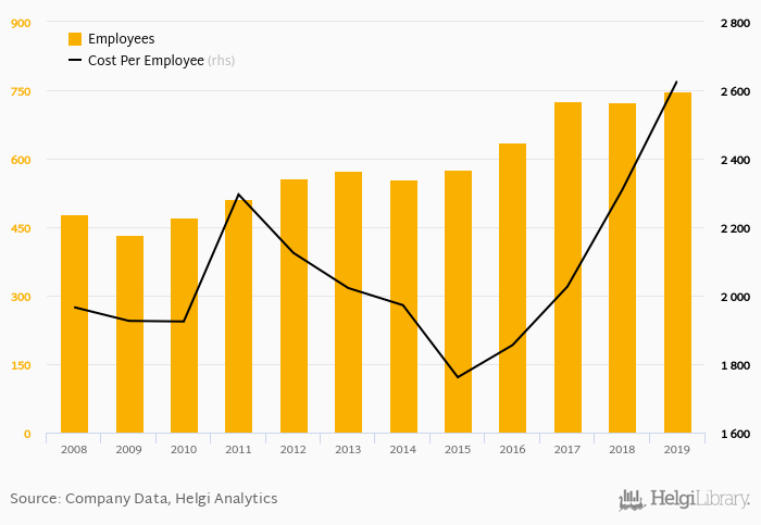 Staff cost represented 10.7% of sales in 2019, 0.615 pp higher than a decade ago.
