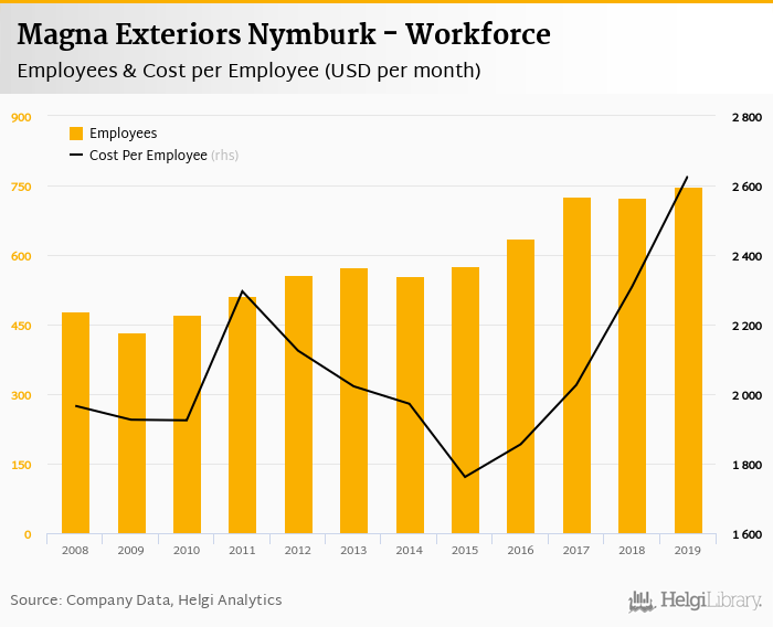 Magna Exteriors Nymburk employed 748 employees in 2019, up 3.31% compared to the previous year. Historically, between 2008 and 2019, the firm's workforce hit a high of 748 employees in 2019 and a low of 434 employees in 2009.