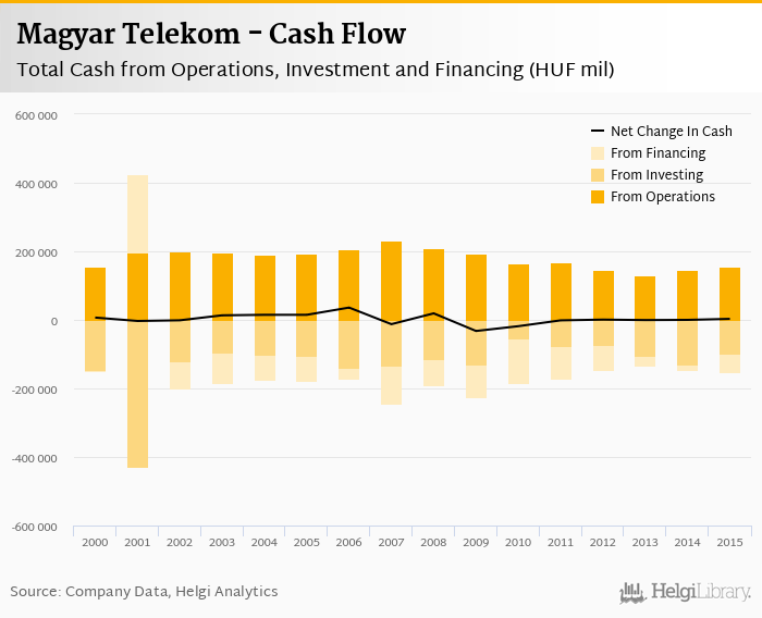 Magyar Telekom's operating cash flow stood at HUF 156,298 mil in 2015, up 7.42% when compared to the previous year. Historically, between 2000 - 2015, the firm’s operating cash flow reached a high of HUF 231,340 mil in 2007 and a low of HUF 131,612 mil in 2013.