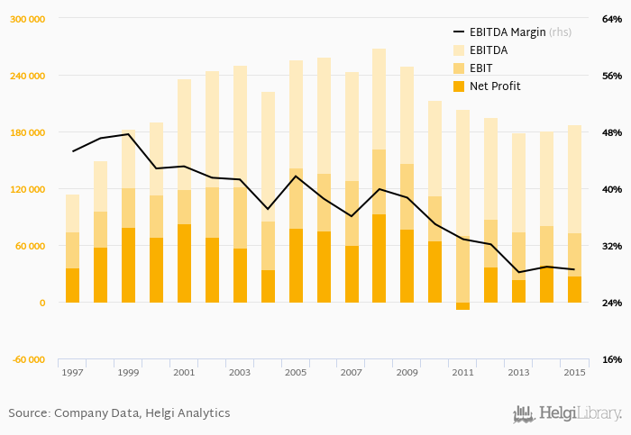 On the operating level, EBITDA reached HUF 187,301 mil, up 3.35% compared to the previous year. Over the last five years, company's EBITDA has fallen 2.54% a year on average.